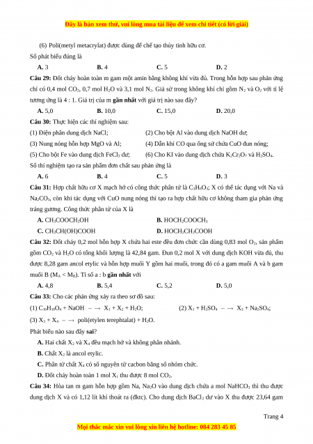 Câu 3: Dung dịch nào sau đây dùng để phân biệt metyl axetat và etyl acrylat? A. HCl B. quỳ tím C. NaOH D. nước Br2
