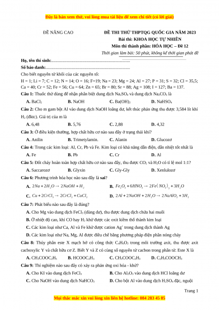 Môn thi thành phần: HÓA HỌC – Đề 12