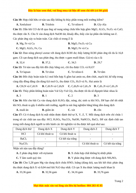 Câu 10: Hợp chất hữu cơ nào sau đây không bị thủy phân trong môi trường kiềm? A. Xenlulozơ B. Triolein C. Tơ nilon-6 D. Gly-Ala