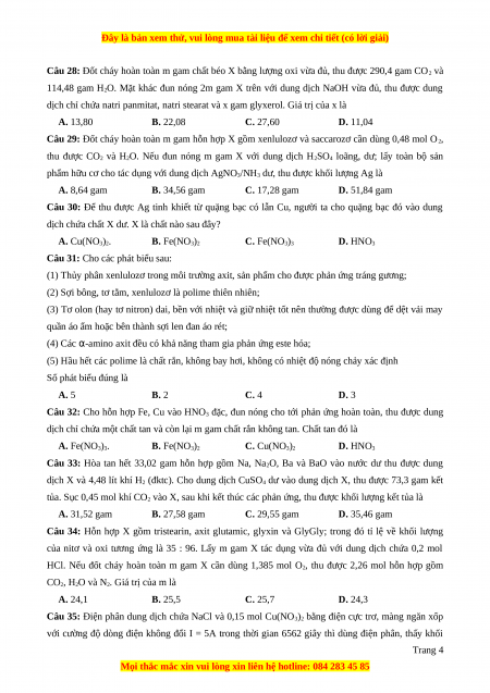 Câu 29: Đốt cháy hoàn toàn m gam hỗn hợp X gồm xenlulozơ và saccarozơ cần dùng 0,48 mol O