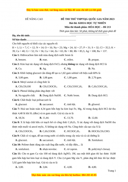 Môn thi thành phần: HÓA HỌC – Đề 213
