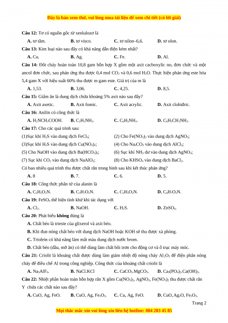 Câu 10: Polime được dùng sản xuất ống dẫn nước, vỏ dây điện,... là A. xenlulozơ. B. nhựa novolac. C. tơ capron. D. poli(vinyl clorua).