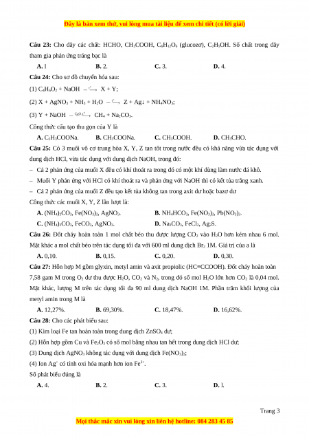 Câu 23: Cho dãy các chất: HCHO, CH3COOH, C6H12O6 (glucozơ), C2H5OH. Số chất trong dãy