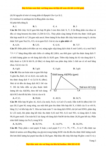 Câu 40: Thủy phân x mol peptit X hoặc y mol peptit Y ( , X và Y đều được tạo