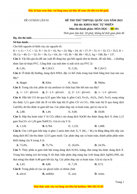 Môn thi thành phần: HÓA HỌC – Đề 103
