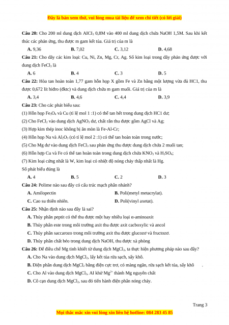 Câu 21: Cho dãy các kim loại: Cu, Ni, Zn, Mg, Cr, Ag. Số kim loại trong dãy phản ứng được với dung dịch FeCl3 là A. 6 B. 4 C. 3 D. 5