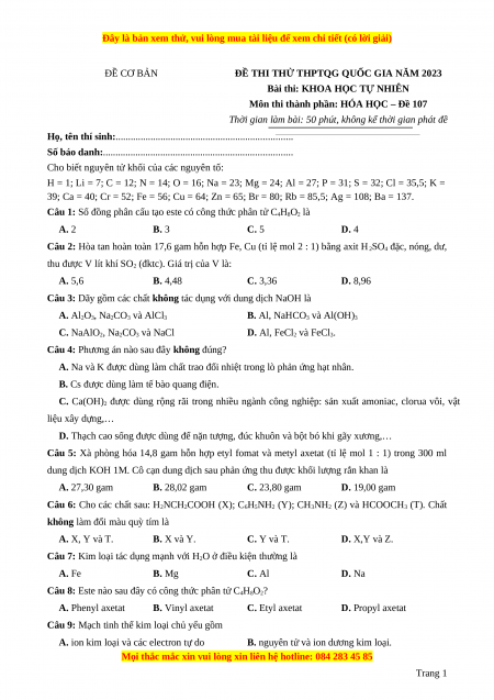 Môn thi thành phần: HÓA HỌC – Đề 107