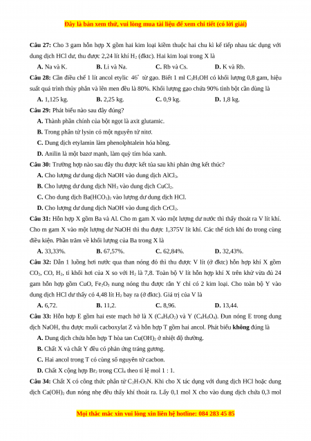 Câu 27: Cho 3 gam hỗn hợp X gồm hai kim loại kiềm thuộc hai chu kì kế tiếp nhau tác dụng với