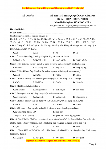 Môn thi thành phần: HÓA HỌC – Đề 9