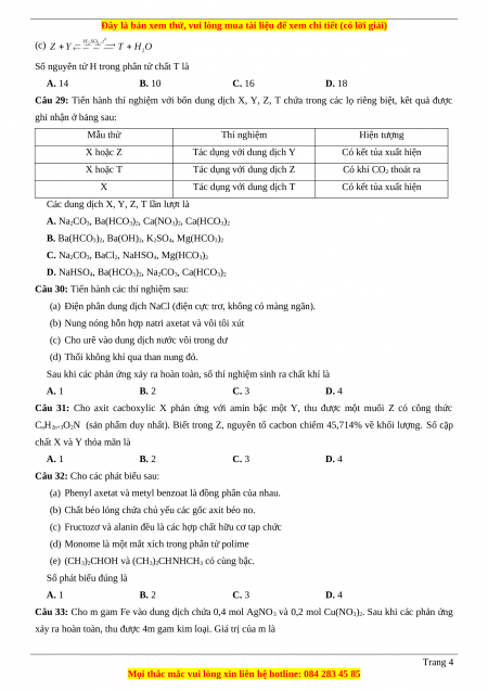 Câu 29: Tiến hành thí nghiệm với bốn dung dịch X, Y, Z, T chứa trong các lọ riêng biệt, kêt quả được ghi nhận ở bảng sau: Mẫu thử Thí nghiệm Hiện tượng X hoặc Z