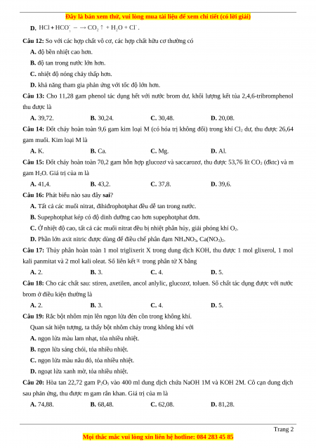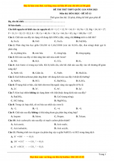 Câu 5: Kali hiđrocacbonat phản ứng được với dung dịch nào sau đây ở nhiệt độ thường? A. NaNO3. B. HCl. C. Ba(NO3)2. D. K2SO4.