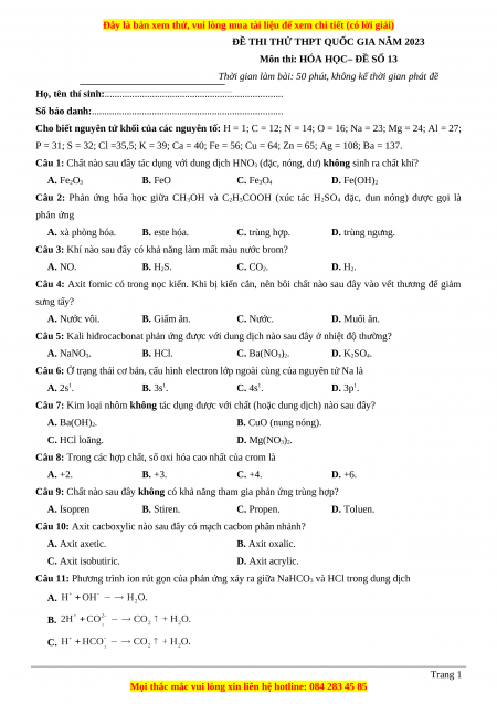 Môn thi: HÓA HỌC– ĐỀ SỐ 13