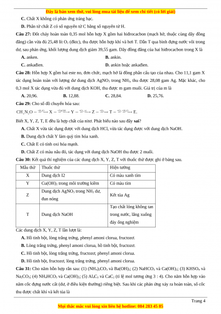 Câu 30: Kết quả thí nghiệm của các dung dịch X, Y, Z, T với thuốc thử được ghi ở bảng sau.