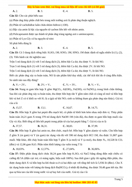 Câu 31: Cho năm hỗn hợp rắn sau: (1) (NH4)2CO3 và Ba(OH)2; (2) NaHCO3 và Ca(OH)2; (3) KHSO4 và