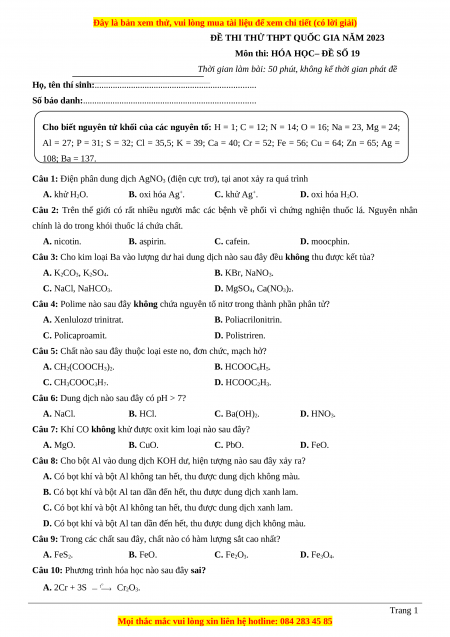 Môn thi: HÓA HỌC– ĐỀ SỐ 19