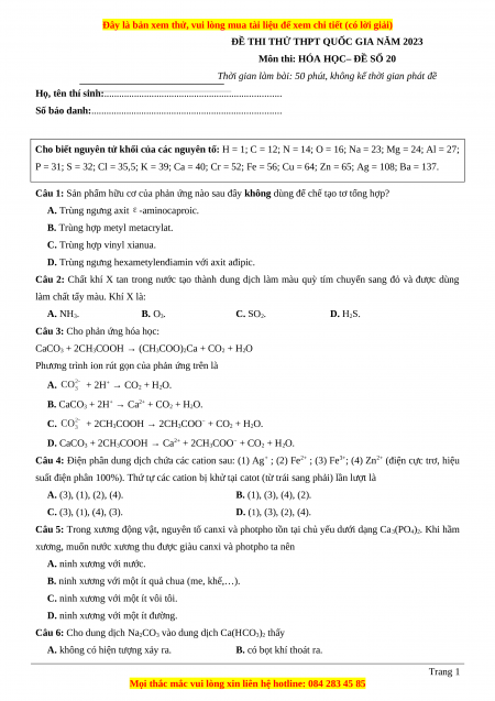 Môn thi: HÓA HỌC– ĐỀ SỐ 20