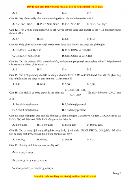 Câu 11: Dãy nào sau đây gồm các ion ở nồng độ cao gây ô nhiễm nguồn nước? A. Na+, Bb2+, PO 3- 3- - 2- - 2- 4 B. PO4 , NO3 , SO4 C. Fe3+, NO3 , K+ D. SO4 , Na+, Hg2+