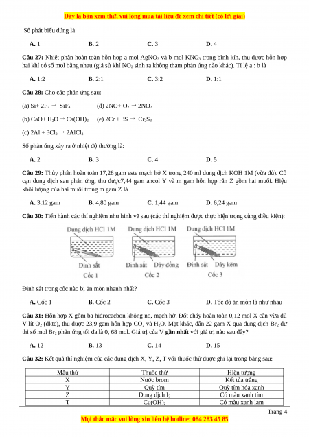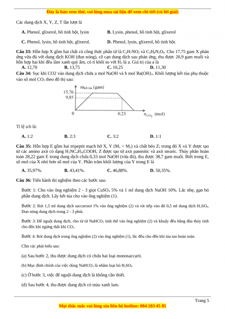 Câu 32: Kết quả thí nghiệm của các dung dịch X, Y, Z, T với thuốc thử được ghi lại trong bảng sau: Mẫu thử Thuốc thử Hiện tượng X Nước brom Kết tủa trắng Y Quỳ tím Quỳ tím hóa xanh Z Dung dịch I2 Có màu xanh tím T Cu(OH)2 Có màu xanh lam Trang 4