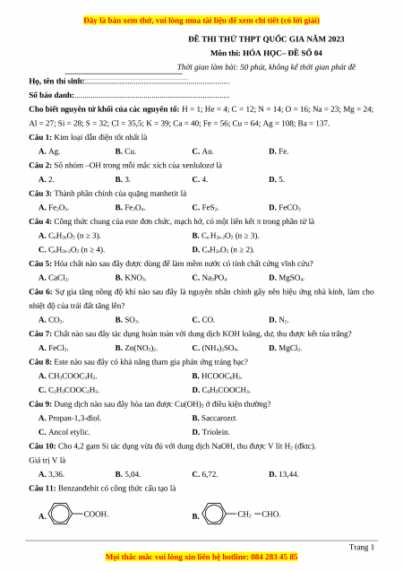 Môn thi: HÓA HỌC– ĐỀ SỐ 04