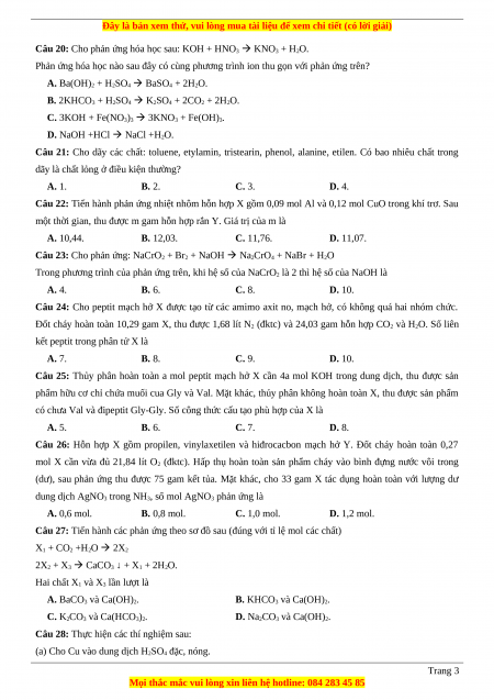 Câu 21: Cho dãy các chất: toluene, etylamin, tristearin, phenol, alanine, etilen. Có bao nhiêu chất trong