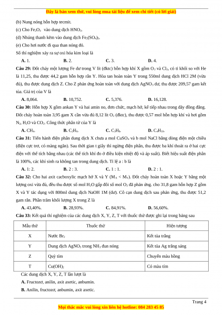 Câu 33: Kết quả thí nghiệm của các dung dịch X, Y, Z, T với thuốc thử được ghi lại trong bảng sau Mẫu thử Thuốc thử Hiện tượng X Nước Br2 Kết tủa trắng Y