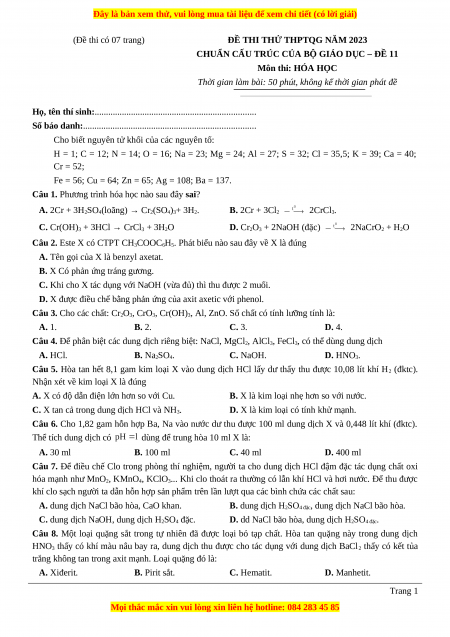 CHUẨN CẤU TRÚC CỦA BỘ GIÁO DỤC – ĐỀ 11 Môn thi: HÓA HỌC