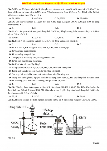 Câu 17. Hình vẽ sau đây mô tả thí nghiệm điều chế và thu khí Y từ hỗn hợp rắn gồm CaCO3 và CaSO3: Khí Y là Trang 2 /