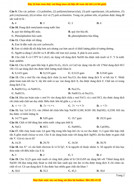 Câu 9. Cho các polime : (1) polietilen, (2) poli(metylmetacrylat), (3) poli caprolactam, (4) polistiren, (5)