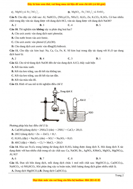 Câu 9. Cho dãy các chất sau: Al, NaHCO3, (NH4)2CO3, NH4Cl, Al2O3, Zn, K2CO3, K2SO4. Có bao nhiêu