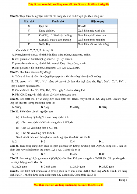 Câu 22. Thực hiện thí nghiệm đối với các dung dịch và có kết quả ghi theo bảng sau: Mẫu thử Thuốc thử Hiện tượng X Quỳ tím Hóa đỏ Y Dung dịch iot. Xuất hiện màu xanh tím Z