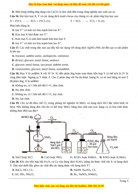Câu 16. Hai kim loại X, Y và các dung dịch muối clorua của chúng có các phản ứng hóa học sau: X + 2YCl3 XCl2 + 2YCl2 (1); Y + XCl2 YCl2 + X (2); Phát biểu đúng là:
