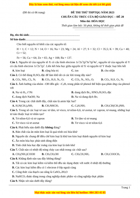 CHUẨN CẤU TRÚC CỦA BỘ GIÁO DỤC – ĐỀ 20 Môn thi: HÓA HỌC