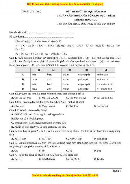 Câu 1. “Khi đun nóng protein với dung dịch …(1)… và dung dịch …(2)… hay nhờ xúc tác của …(3)