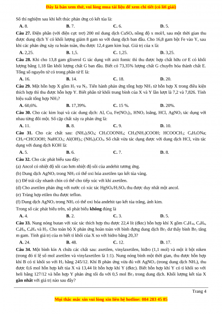 Câu 19. Số công thức cấu tạo của C8H10O là dẫn xuất cùa benzen, không tác dụng với Natri là: A. 7. B. 6. C. 5. D. 4. Trang 2