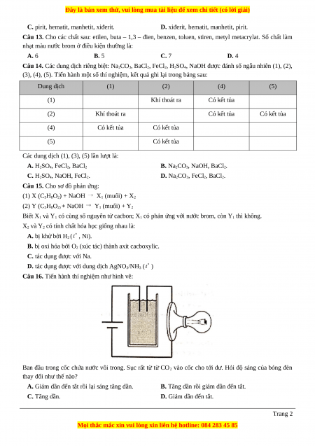 Câu 13. Cho các chất sau: etilen, buta – 1,3 – đien, benzen, toluen, stiren, metyl metacrylat. Số chất làm