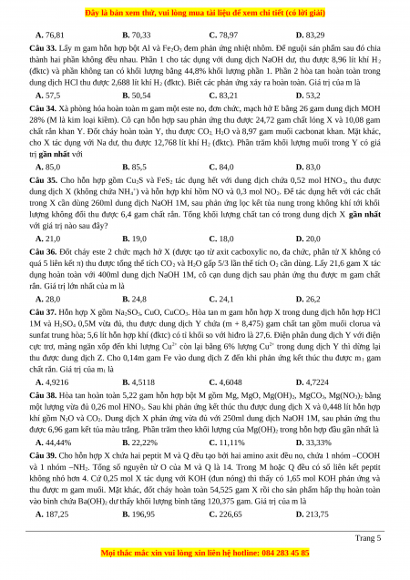Câu 33. Lấy m gam hỗn hợp bột Al và Fe2O3 đem phản ứng nhiệt nhôm. Để nguội sán phẩm sau đó chia
