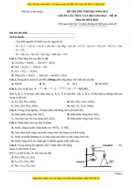 CHUẨN CẤU TRÚC CỦA BỘ GIÁO DỤC – ĐỀ 30 Môn thi: HÓA HỌC
