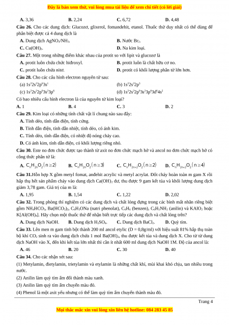 Câu 26. Cho các dung dịch: Glucozơ, glixerol, fomandehit, etanol. Thuốc thử duy nhất có thể dùng để