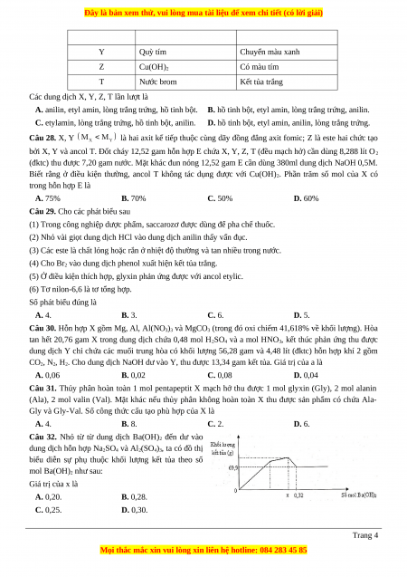 Câu 27. Kết quả thí nghiệm của các dung dịch X, Y, Z, T với thuốc thử được ghi ở bảng sau: Mẫu thử Thuốc thử Hiện tượng X Dung dịch I2 Có màu xanh tím Trang 3