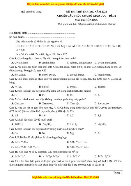 CHUẨN CẤU TRÚC CỦA BỘ GIÁO DỤC – ĐỀ 32 Môn thi: HÓA HỌC