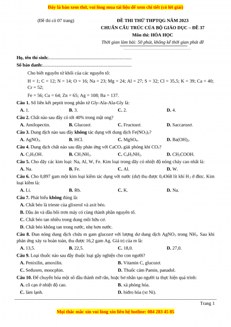 CHUẨN CẤU TRÚC CỦA BỘ GIÁO DỤC – ĐỀ 37 Môn thi: HÓA HỌC