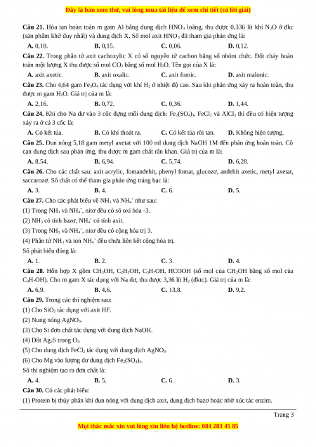 Câu 24. Khi cho Na dư vào 3 cốc đựng mỗi dung dịch: Fe2(SO4)3, FeCl2 và AlCl3 thì đều có hiện tượng xảy ra ở cả 3 cốc là: A. Có kết tủa. B. Có khí thoát ra.