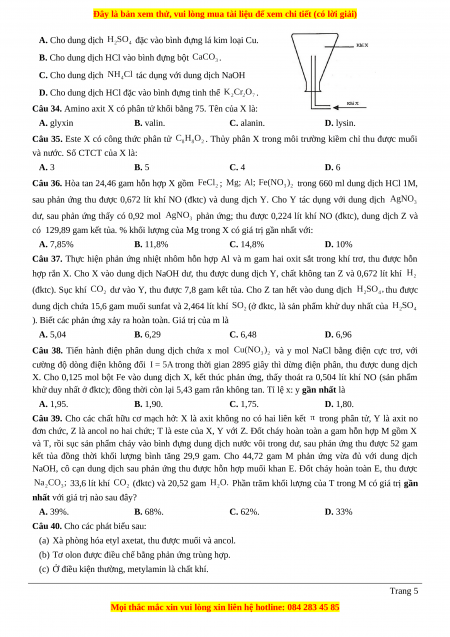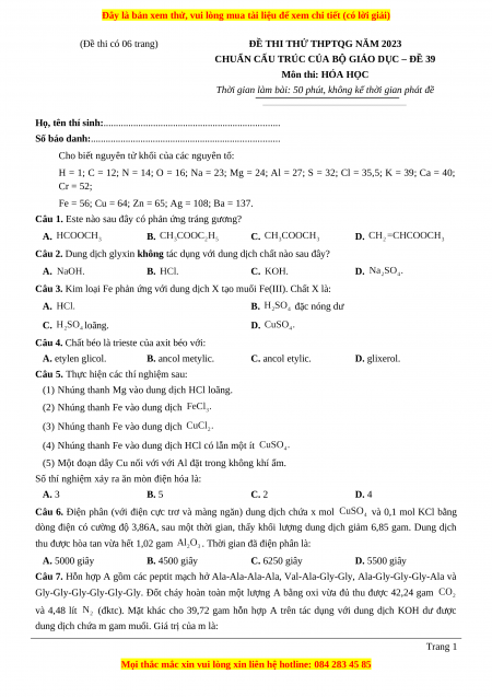 CHUẨN CẤU TRÚC CỦA BỘ GIÁO DỤC – ĐỀ 39 Môn thi: HÓA HỌC