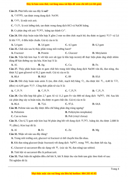 Câu 25. Chất nào sau bị thủy phân trong môi trường bazơ? A. Fructozơ B. Protein C. Glucozơ D. Metylamin