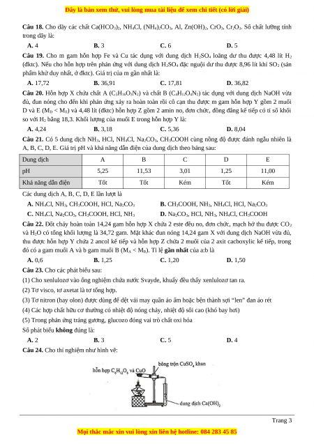 Câu 18. Cho dãy các chất Ca(HCO3)2, NH4Cl, (NH4)2CO3, Al, Zn(OH)2, CrO3, Cr2O3. Số chất lưỡng tính trong dãy là: A. 4 B. 3 C. 6 D. 5