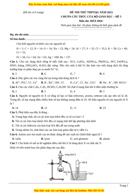 CHUẨN CẤU TRÚC CỦA BỘ GIÁO DỤC – ĐỀ 5 Môn thi: HÓA HỌC
