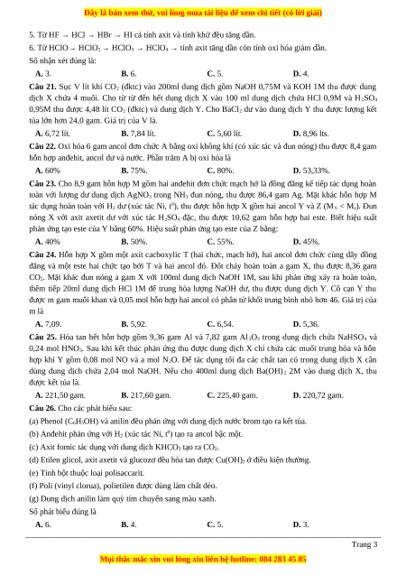 Câu 18. Cho các chất: isopren, stiren, cumen, ancol allylic, anđehit acrylic, axit acrylic, triolein. Số chất