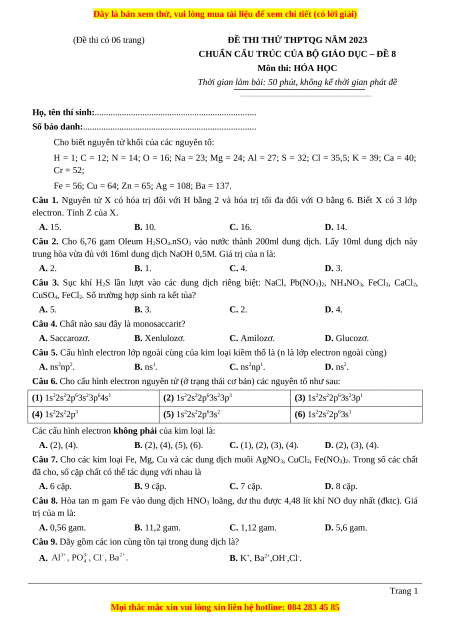 CHUẨN CẤU TRÚC CỦA BỘ GIÁO DỤC – ĐỀ 8 Môn thi: HÓA HỌC