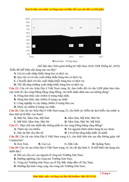 Câu 25: Căn cứ vào Atlat Đ a ị lí Vi t ệ Nam trang 26, theo bi u ể đồ cơ c u ấ GDP phân theo khu v c ự kinh t ế c a ủ vùng Đ ng ồ b ng ằ sông H ng, ồ cho bi t ế nh n ậ đ nh ị nào sau không đúng? A. Nông lâm th y ủ s n ả chi m ế t ỉtr ng ọ th p ấ nh t. ấ B. Nông lâm th y ủ s n ả chi m ế t ỉtr ng ọ cao nh t. ấ C. Công nghi p ệ và xây d ng ự chi m ế t ỉtr ng ọ khá cao. D. D c ị h v ụ chi m ế t ỉtr ng ọ cao nh t. ấ Câu 26: Căn c ứ vào Atlat Đ a ị lí Vi t ệ Nam trang 25, cho bi t ế các đi m ể du l c ị h bi n ể c a ủ nư c ớ ta theo th ứ t ự t ừ B c ắ vào Nam? A. Mũi Né, S m ầ S n, ơ M ỹ Khê. B. Sầm S n, ơ M ỹ Khê, Mũi Né. C. M ỹ Khê, S m ầ S n, ơ Mũi Né. D. Sầm S n, ơ Mũi Né, M ỹ Khê.