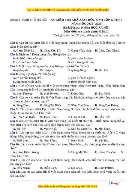 Đây là bản xem th , vu ử i lòng mua tài li u ệ đ xe ể m chi ti t ế (có l i ờ gi i ả ) UBND THÀNH PH Ố HÀ N I Ộ KỲ KI M Ể TRA KH O Ả SÁT H C Ọ SINH L P Ớ 12 THPT NĂM H C Ọ 2022 - 2023 Bài ki m ể tra: KHOA H C Ọ XÃ H I Ộ